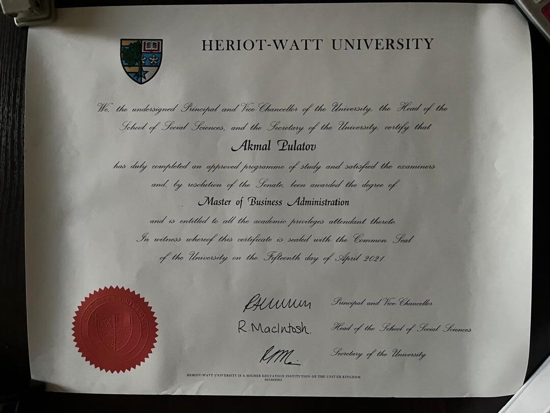 У меня степень MBA Университета Heriot Watt (Великобритания). В настоящее время я учусь онлайн в Университете Essex (Великобритания).