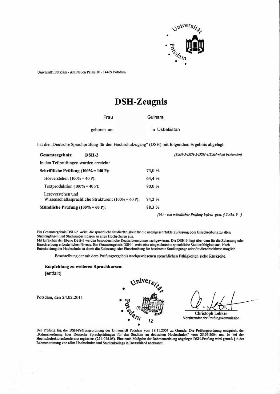 Здравствуйте! Меня зовут Гульнара, я сертифицированный преподаватель немецкого языка с подтверждённым уровнем DSH-2 (Deutsche Sprachprüfung für den Hochschulzugang) от Университета Потсдам (Германия).