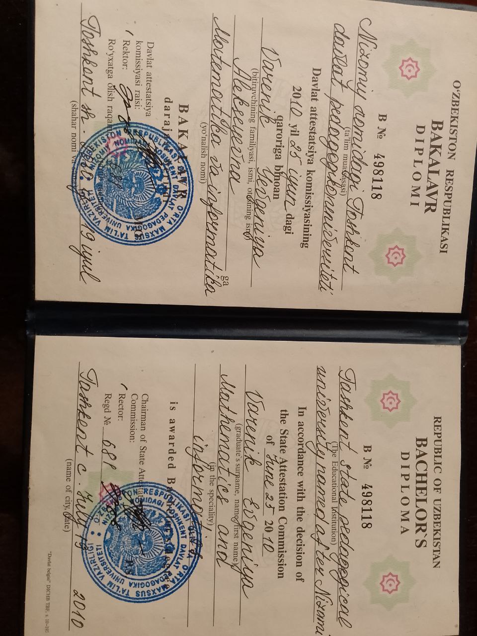 О себе: Меня зовут Вареник Евгения Алексеевна. Я успешно окончила Ташкентский Государственный Педагогческий университет по направлению Математика — Информатика. В настоящее время работаю в школе. Для записи на занятия и дополнительных вопросов звоните или пишите в Telegram: Repet_uz пишите в телеграмм. С нетерпением жду встречи с вами!